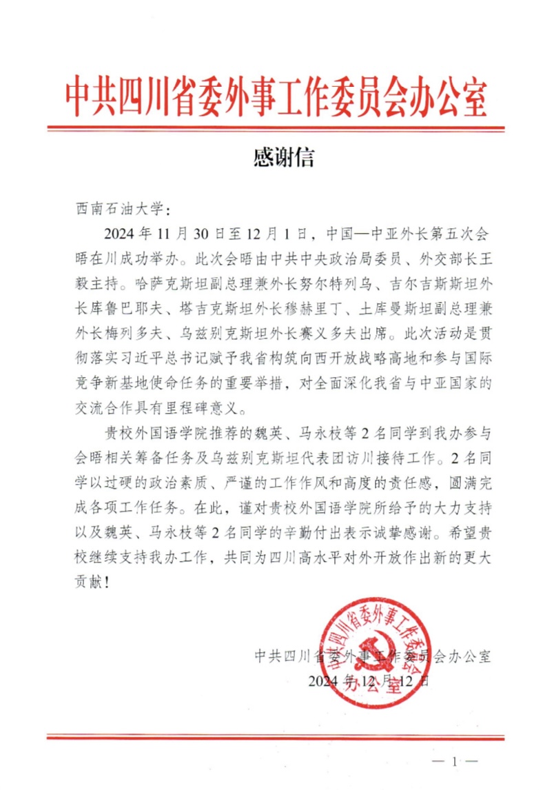 中共四川省委外事工作委員會辦公室向我校發來感謝信