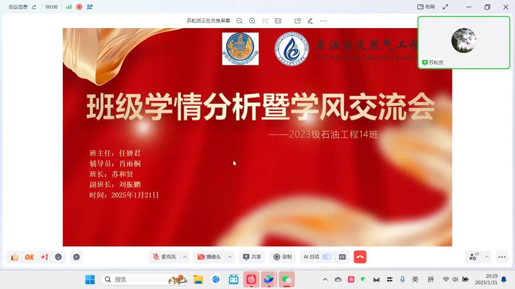 石油工程2021級(創(chuàng)新)2班班主任由李穎副教授擔任。她提醒學生在學習課程的同時要積極推進畢業(yè)論文工作,主動與畢業(yè)設計指導老師溝通,合理協(xié)調考研復試和畢業(yè)設計時間。如果復試獲得通過,應爭取提前進入導師的課題組;對于準備就業(yè)的同學,要密切關注春招,嘗試多元化就業(yè)。學習委員通報了上學期課程考試情況,表示下學期將完善學習小組制度。