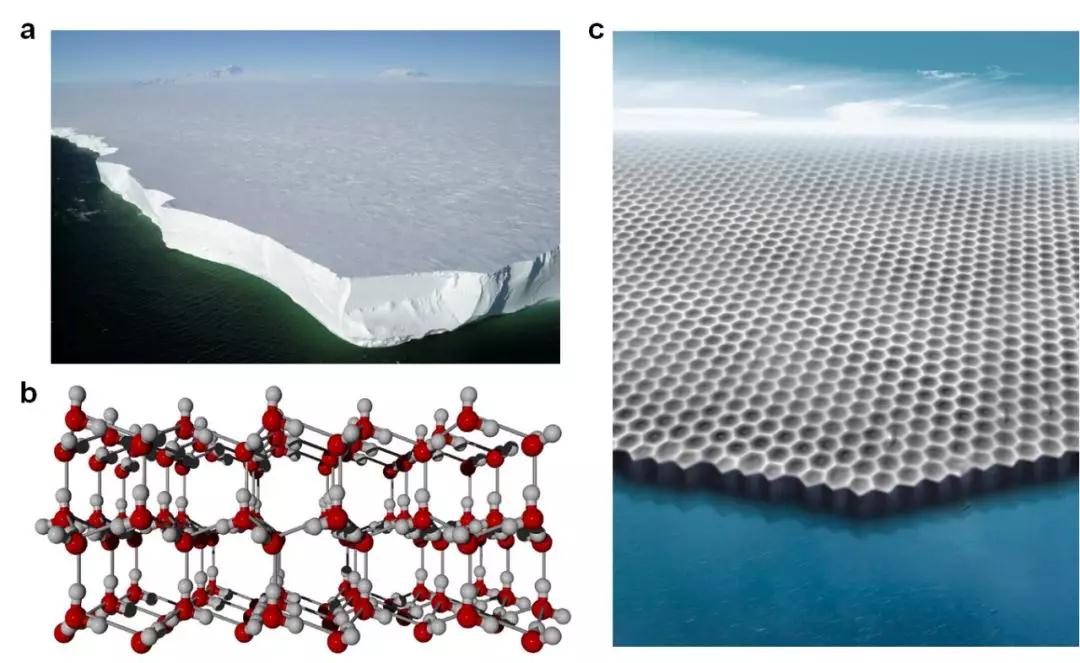 (a)南極羅斯海上的厚冰層;(b)自然界最常見冰相(Ice Ih)的分子模型;(c)本研究發現的二維冰(實驗結果的3D效果圖)。受訪者供圖