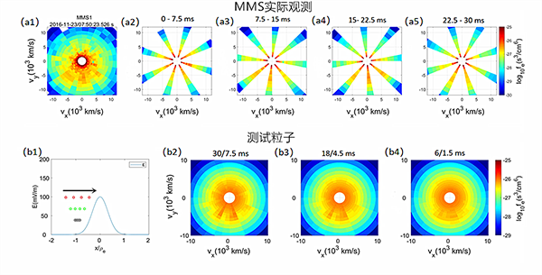 圖2.對手指狀分布的觀測和測試粒子計算結果,其中,a1是由a2-a5四個連續的7.5毫秒探測單元的數據拼接而成,而b2-b4是在三種不同采樣率下的測試粒子計算結果