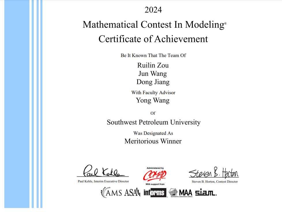 Recently, results of the Mathematical Contest in Modeling (hereinafter referred to as MCM) and the Interdisciplinary Contest in Modelling (hereinafter referred to as ICM) 2024 have been announced. SWPU delegation has won 3 Meritorious Winners and 6 Honorable Mentions.