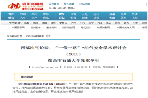 近日,光明網(wǎng)、國(guó)務(wù)院新聞辦公室、中國(guó)能源網(wǎng)、四川新聞網(wǎng)、四川日?qǐng)?bào)、四川電視臺(tái)等近三十余家新聞媒體以《西部油氣論壇:聚焦“一帶一路”與油氣安全》為題,分別對(duì)由西南石油大學(xué)、四川省社會(huì)科學(xué)界聯(lián)合會(huì)、石油工業(yè)出版社聯(lián)合主辦,四川石油天然氣發(fā)展研究中心承辦的“西部油氣論壇:‘一帶一路’與油氣安全學(xué)術(shù)研討會(huì)”進(jìn)行了報(bào)道,其中國(guó)務(wù)院新聞辦公室做了“秉持親誠(chéng)惠容理念,推動(dòng)沿線國(guó)家發(fā)展,攜手開(kāi)創(chuàng)‘一帶一路’新未來(lái)”的專題報(bào)道。