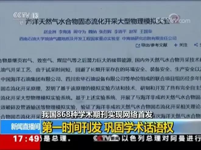 早在10月27日,央視新聞直播間在“我國868種學術期刊實現網絡首發 第一時間刊發 鞏固學術話語權”這則新聞中,以我校學術論文《海洋天然氣水合物固態流化開采大型物理模擬實驗》和模擬實驗的視頻為事例,說明學術論文網絡首發的優越性。