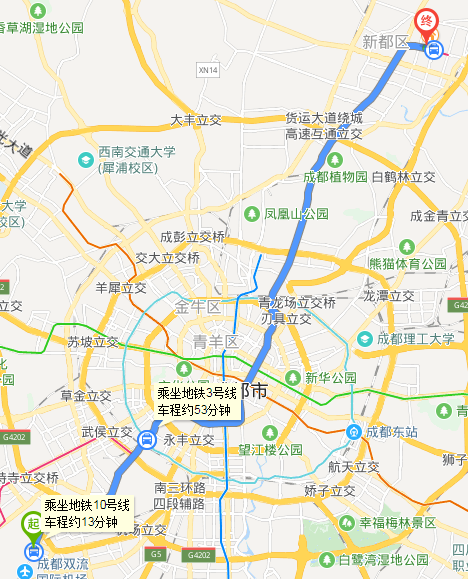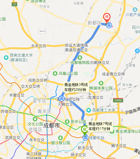 (2)成都雙流機場出發:在雙流機場1航站樓站乘坐地鐵10號線(太平園方向),至太平園站下車,換乘地鐵3號線(成都醫學院方向),在石油大學站下車(D口出),沿新都大道步行到達學校正大門或者沿大學路步行到達學校東一門。