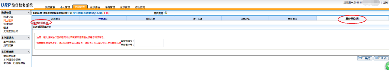 第一步:登錄教務系統,依次點擊導航條中的【選課管理】→【網上選課】,選擇培養方案,然后點擊【重修選課(舊)】,進入重修選課頁面。