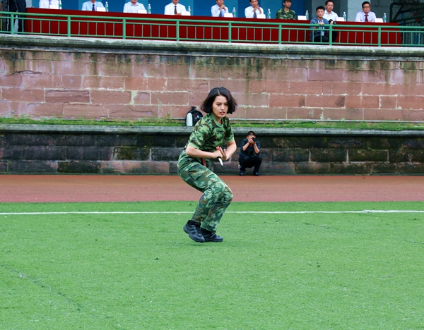 “殺!殺!殺!”的口號響徹足球場,承訓部隊男教官為大家?guī)砹司实那軘橙硌荨=坦賯儌€個精神抖擻,眼神里透露著堅毅,整齊的出拳、踢腿凌厲有力,彰顯出軍人的龍虎聲威,表演博得陣陣掌聲和喝彩。巾幗不讓須眉,女教官個個身手矯健、動作敏捷、招式有力,帶來了精彩的匕首操表演,現(xiàn)場喝彩聲此起彼伏。