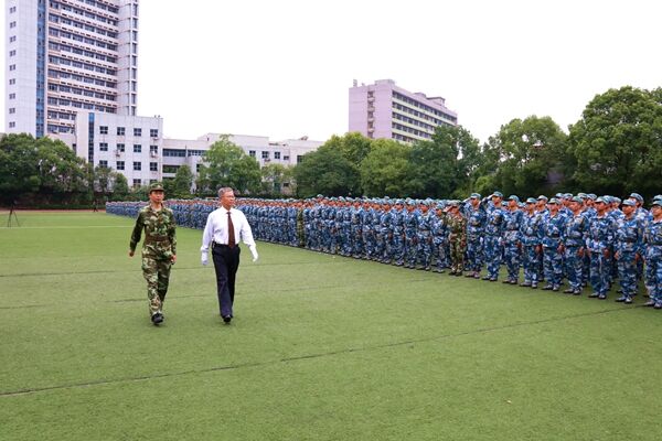 伴隨著莊嚴的國歌聲,國旗隊護送鮮艷的五星紅旗緩緩入場。王勝軍在任果少校的陪同下檢閱了新生軍訓方陣。參訓同學士氣高昂、神采飛揚、英姿颯爽。“同學們好!”、“同學們辛苦了!”表達了王勝軍對參訓同學的親切問候。“刻苦學習,為學校爭光”彰顯著學子們的豪情壯志。