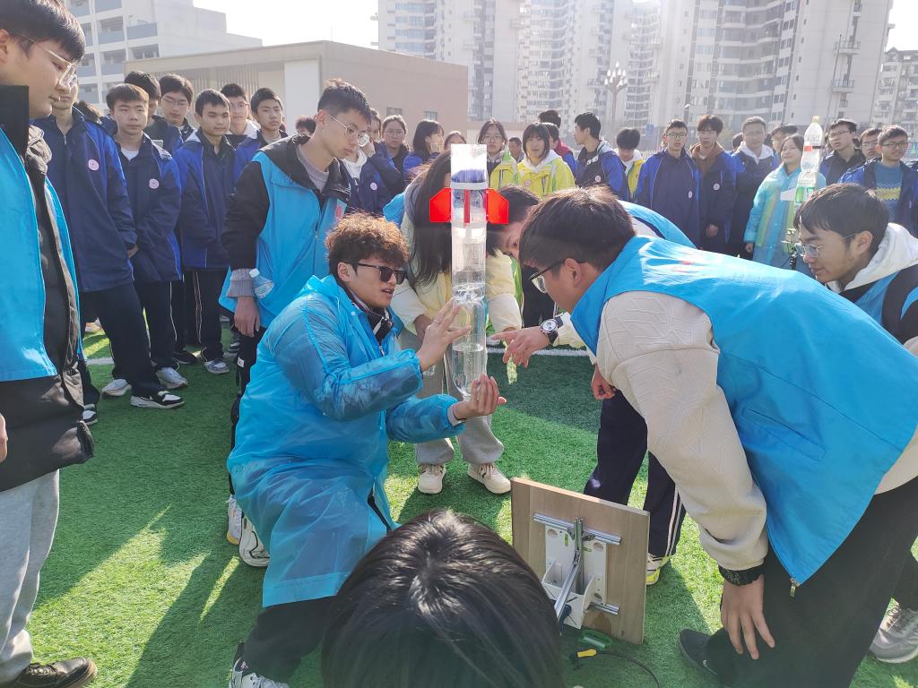 活動現場,機電工程學院“柚見藍天”科普團隊的師生展示了智能機器人、水火箭技術,進行了滑翔機和紙飛機等航模飛行表演,宣傳了航模科普知識。團隊成員操控機械狗展示了一系列萌趣動作,點燃了現場熱烈的氣氛,博得同學們陣陣喝彩。在水火箭技術展示環節,隨著巨大壓力的釋放,水火箭如離弦之箭騰空而起,直沖云霄,現場學生驚嘆不已。在航模飛行表演環節,團隊成員展示了自制的各類航模,介紹了航模制作知識、操控技巧以及相關的物理、材料化學相關知識。滑翔機、F3P、紙飛機、TT 等各類航模在飛行手的精準操控下,于藍天之上穿梭翱翔,時而攀升云端,時而俯沖掠地,其精彩絕倫的表演贏得了全場師生的熱烈掌聲與歡呼聲。