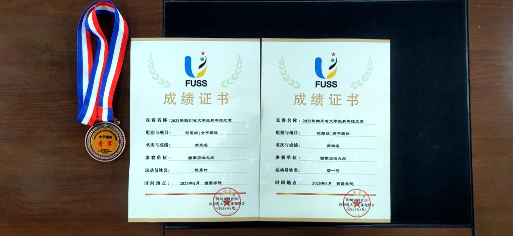 5月25日至29日,由四川省教育廳主辦,四川省大學生體育協會執行,西昌學院承辦的2025年四川省大學生乒乓球比賽在四川西昌舉行。教務部文化素質與公共基礎課教學中心何俊老師帶隊參賽,土測院學生賴昱竹和成都校區學生組隊參加女子團體比賽,獲女子團體季軍;計科院學生雷一可和成都校區學生組隊參加男子團體比賽,獲男子團隊第四名。