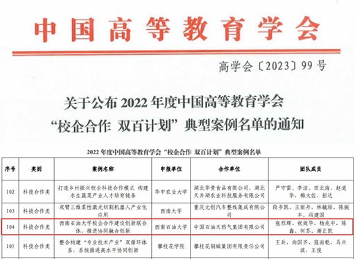 近日,中國高等教育學會公布了2022年度“校企合作 雙百計劃”(下稱“雙百計劃”)典型案例名單,我校申報的《西南石油大學校企合作建設創新聯合體,推進協同融合創新》案例入選。目前,我校有2項案例入選。