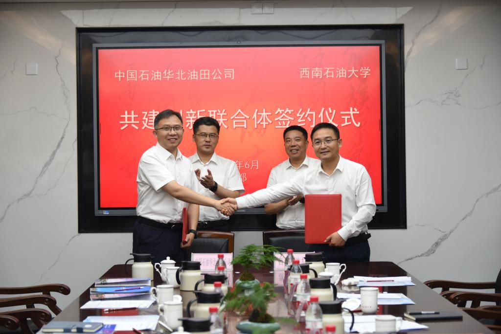 6月20日,中國石油華北油田公司(簡稱華北油田公司)黨委副書記、總經理武璽一行來校調研交流,推進校企共建創新聯合體相關工作。校黨委副書記、校長郭建春接待了來賓并座談交流。校黨委常委、副校長祝效華主持會議,并代表學校與華北油田公司副總經理王鋒簽署共建創新聯合體框架協議。