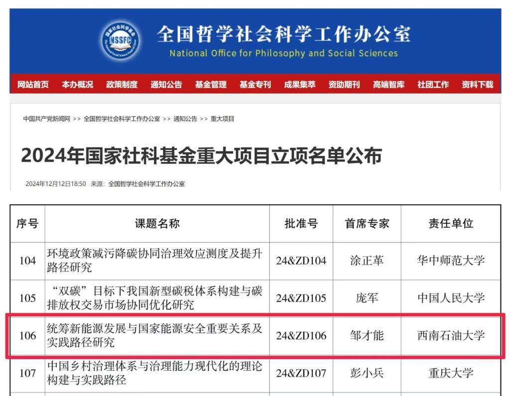 12月12日,全國哲學社會科學工作辦公室公布了2024年度國家社科基金重大項目立項名單,由我校經濟管理學院鄭小強教授、李廷副教授團隊組織申報的“統籌新能源發展與國家能源安全重要關系及實踐路徑研究”(24&ZD106)獲準立項。我校兼職博導、中國科學院院士鄒才能擔任該項目首席專家,西南石油大學、國家發展改革委能源研究所、中國石油經濟技術研究院、華北電力大學、西南財經大學五家單位聯合攻關。