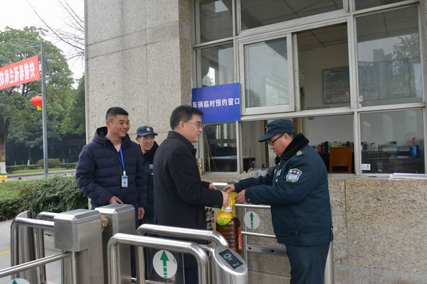 校領導首先來到南大門看望慰問安保人員并與他們一一握手。趙金洲說,今天是大寒,你們在室外值班,手都是冰涼的,大家辛苦了,請多多保重身體。