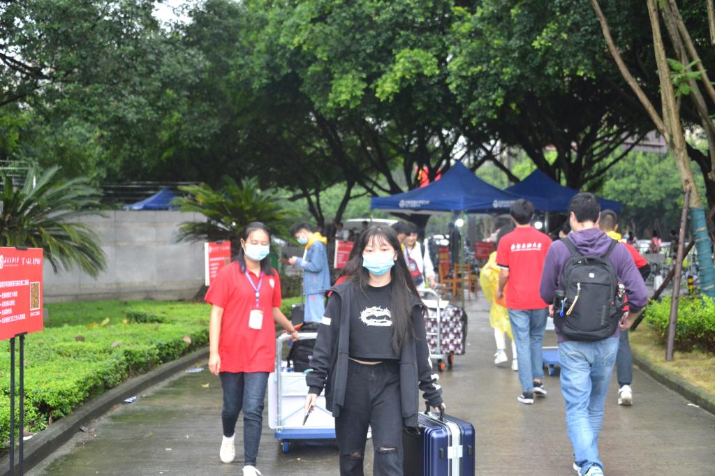 在安檢口,同學(xué)們與父母告別,走過(guò)長(zhǎng)長(zhǎng)的安檢通道,走進(jìn)校園,開啟了全新的大學(xué)生活。因?yàn)榧议L(zhǎng)不能進(jìn)入校園,新生們自己拖著行李進(jìn)校報(bào)到。校團(tuán)委、青志協(xié)、各學(xué)院志愿者熱心周到地幫助新生搬運(yùn)行李,為新生答疑解惑,讓遠(yuǎn)離家人的大一柚子感受到家的暖意。