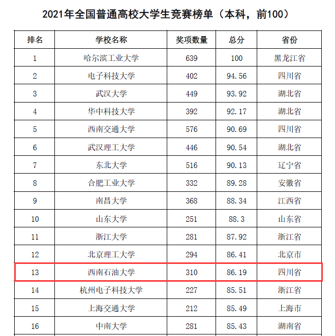 2月22日,中國高等教育學會發布2021全國普通高校大學生競賽分析報告,在《2021年全國普通高校大學生競賽榜單(本科)》中,我校以310個獎項,86.19分的成績位列全國13,較2020年大幅提升20名。