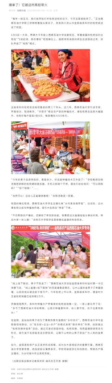 短短兩天,這批枇杷就銷售一空,種植戶羅敏樂開了花:“多虧了西南石油大學,讓我們種得科學,收入可觀,日子更有盼頭!”今年,她特意將自家產的枇杷送給曾在金陽中學和務科村開展志愿服務的學生,以表感激。