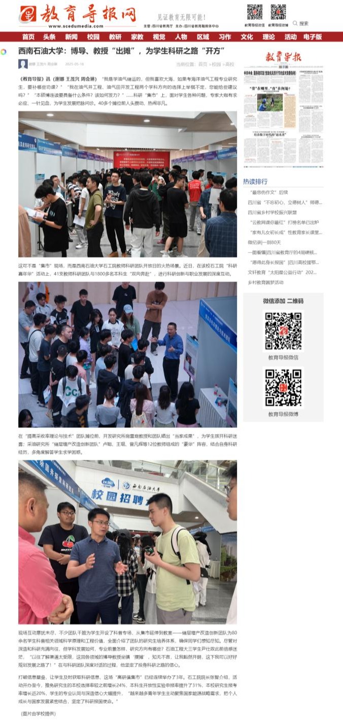 現場互動意猶未盡,不少團隊干脆為學生開設了科普專場,從集市延伸到教室——儲層增產改造創新團隊為80余名學生科普相關領域科學原理和工程價值,全面介紹了團隊的研究生培養體系,確保同學們想知盡知。盡管對深造和科研充滿向往,但學科發展如何,專業前景怎樣,研究方向有哪些?石油工程大三學生尹仕政此前倍感迷茫,“以往了解渠道太受限,這回各領域的博導教授坐鎮‘擺攤’,知無不言,讓我豁然開朗,這下我可以好好規劃發展之路了!”在與科研團隊深度對話的過程,他堅定了投身科研之路的信心。