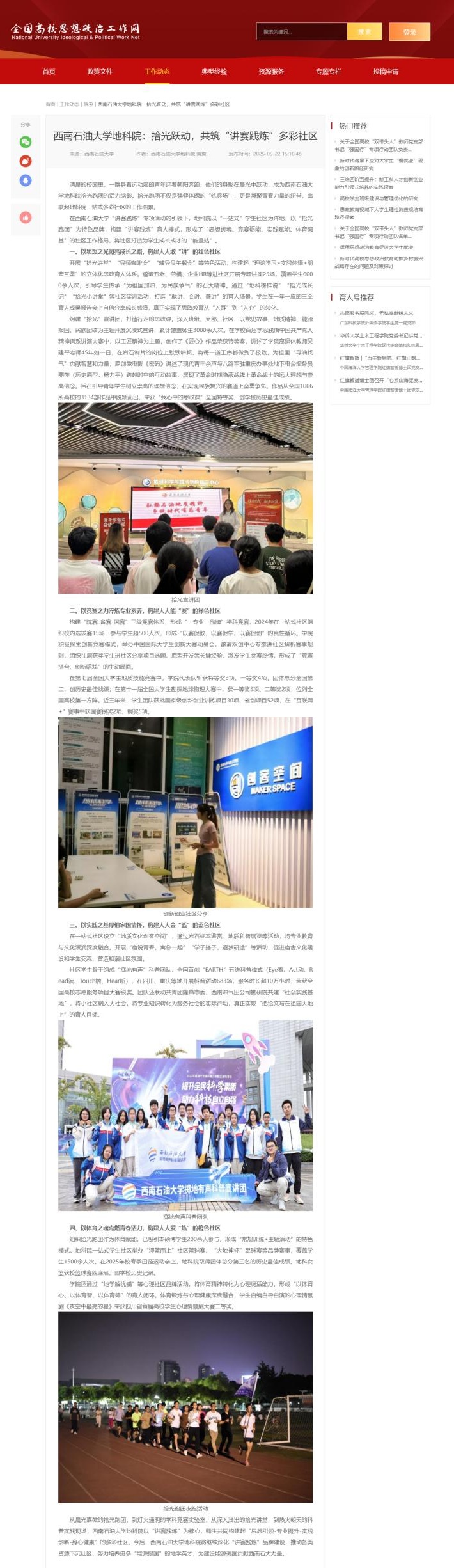 開展“拾光講堂”“導師咖啡會”“輔導員午餐會”等特色活動,構建起“理論學習+實踐體悟+朋輩互鑒”的立體化思政育人體系。邀請五老、勞模、企業HR等進社區開展專題講座25場,覆蓋學生6000余人次,引導學生傳承“為祖國加油,為民族爭氣”的石大精神。通過“地科榜樣說”“拾光成長記”“拾光小講堂”等社區實訓活動,打造“敢講、會講、善講”的育人場景,學生在一年一度的三全育人成果報告會上自信分享成長感悟,真正實現了思政教育從“入耳”到“入心”的轉化。