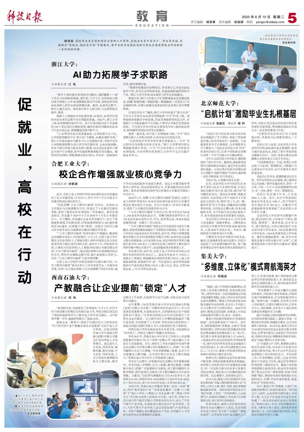 肖虎介紹,西南石油大學推動“就業(yè)—招生—培養(yǎng)”聯(lián)動,堅持“教學緊扣產(chǎn)業(yè)”“培養(yǎng)緊扣需求”,創(chuàng)建“大工程觀”下“通識+學科+工程能力+專業(yè)品牌+第二課堂+學科交叉”的創(chuàng)新實踐育人新體系與方案。近年來,學校與中國石油天然氣集團有限公司等重點單位合作,成立了天然氣現(xiàn)代產(chǎn)業(yè)學院、先進制造與真空技術(shù)產(chǎn)業(yè)學院等。其中,天然氣現(xiàn)代產(chǎn)業(yè)學院入選全國首批現(xiàn)代產(chǎn)業(yè)學院名單。學校產(chǎn)教融合項目覆蓋超20個專業(yè),有效提升人才培養(yǎng)與經(jīng)濟社會發(fā)展需要的適配度。