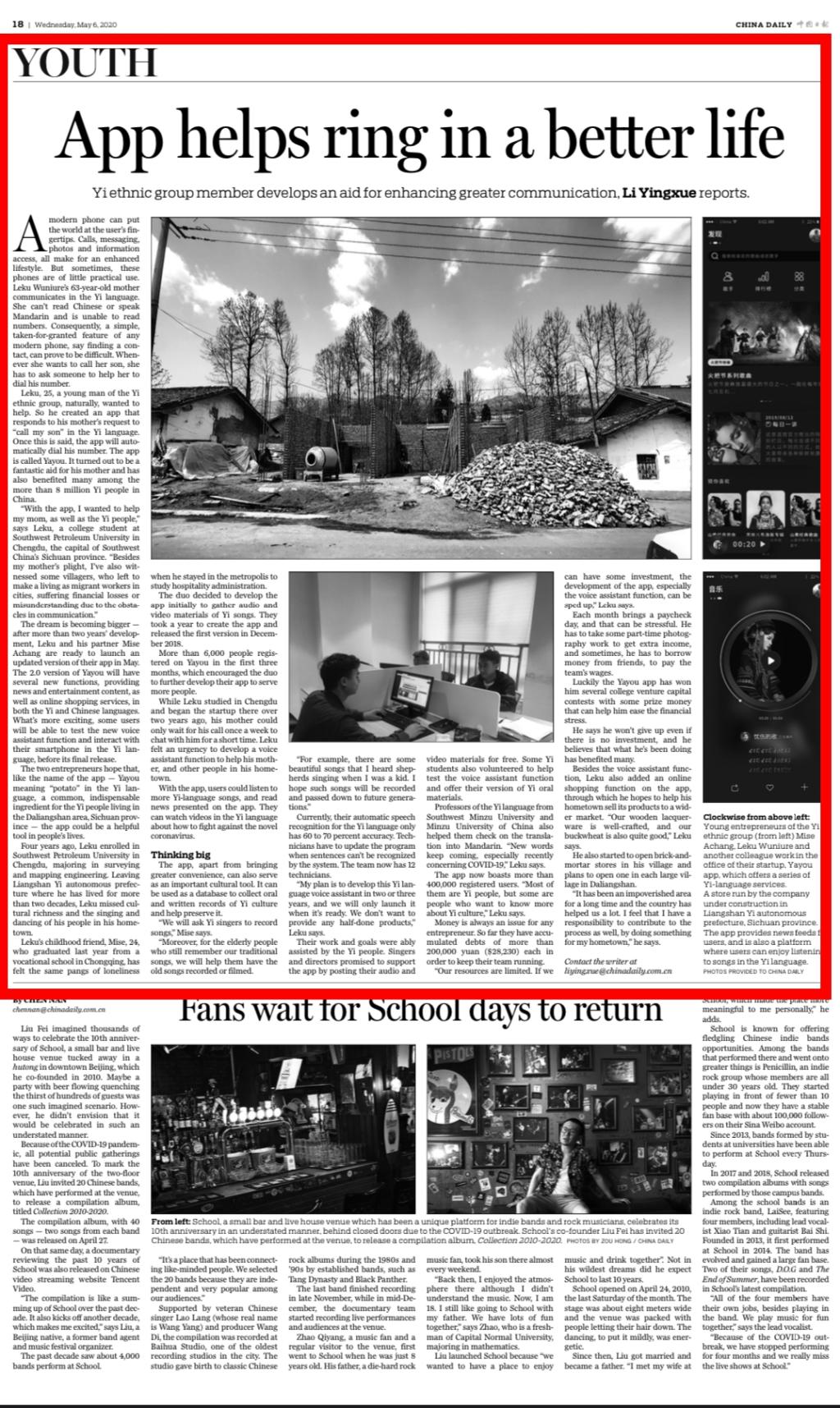 The two entrepreneurs hope that, like the name of the app-Yayou meaning "potato" in the Yi language, a common, indispensable ingredient for the Yi people living in the Daliangshan area, Sichuan province-the app could be a helpful tool in people's lives.