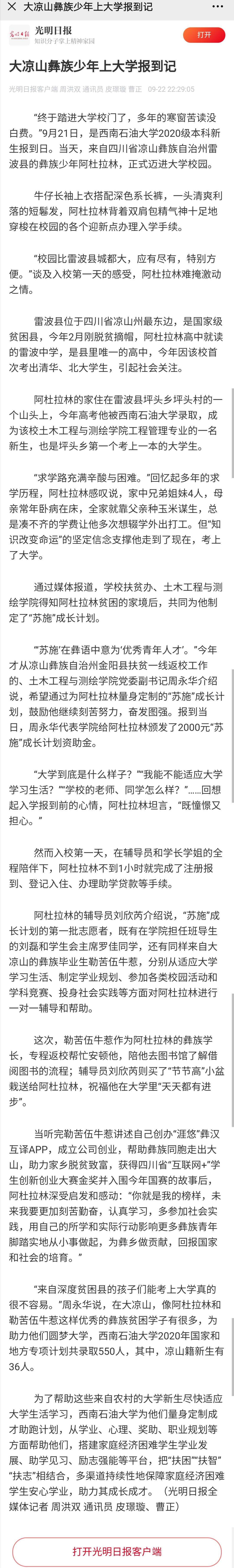 “終于踏進大學校門了,多年的寒窗苦讀沒白費?!?月21日,是西南石油大學2020級本科新生報到日。當天,來自四川省涼山彝族自治州雷波縣的彝族少年阿杜拉林,正式邁進大學校園。