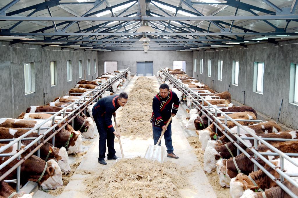 李凱(左)與三河村大學(xué)生返鄉(xiāng)創(chuàng)業(yè)青年洛古有格在養(yǎng)殖場一起勞動。