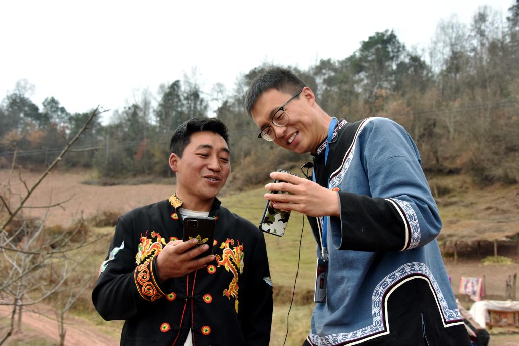 李凱(右)和村民通過手機聯(lián)系遠(yuǎn)方好友 皮璟璇攝