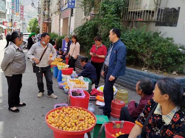 第一書記胡仲成在縣城協調專用攤位,幫助務科村民賣枇杷