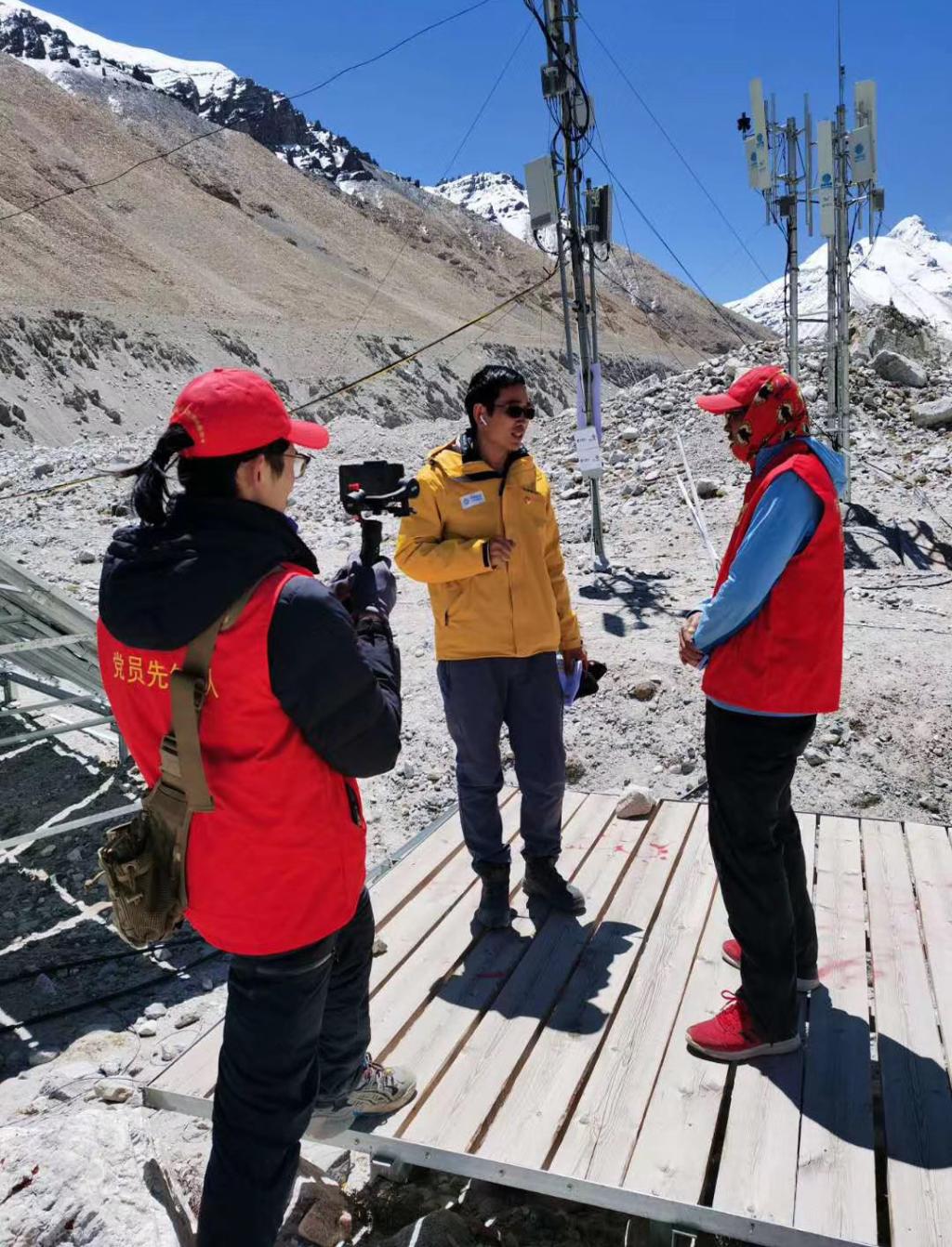 王楊(左一)在位于珠峰海拔5300米處的移動(dòng)基站前拍攝
