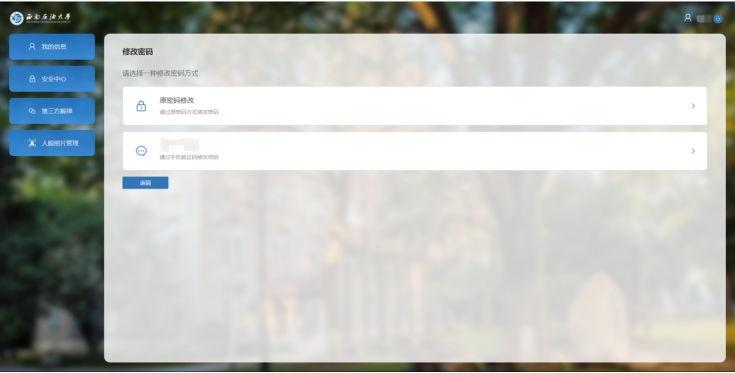 ????(2)自助修改:在校園卡自助服務終端上分別放上身份證和校園卡,點擊“修改密碼”,根據(jù)提示操作。