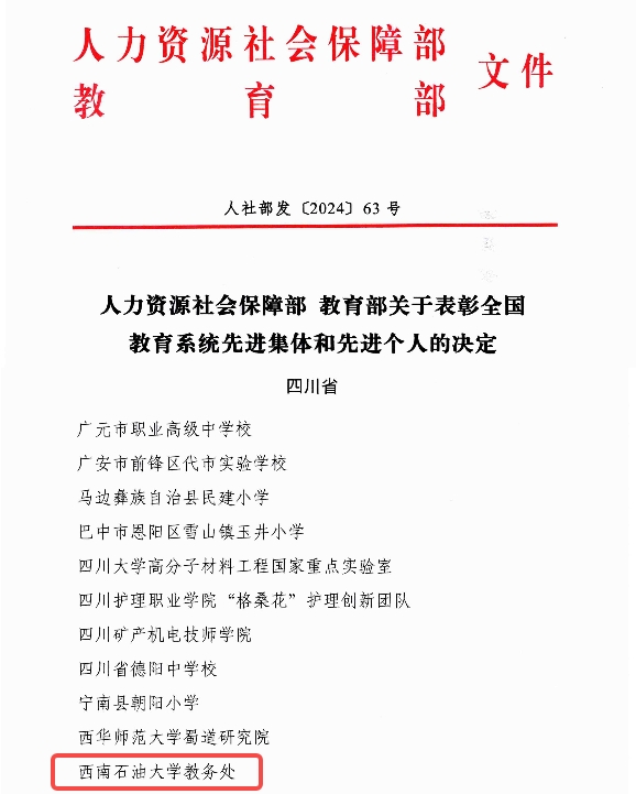 “全國教育系統先進集體”每五年評選一次,是全國教育系統集體最高榮譽。今年6月接到申報通知后,學校黨委行政高度重視,學校領導作出專門部署,黨委教師工作部牽頭開展校內遴選推薦工作,協同擬推薦單位認真準備申報材料。經四川省教育廳評選推薦、全國教育系統評選表彰工作領導小組審核評選,我校教務處榮獲“全國教育系統先進集體”稱號。四川省屬本科高校共有3家單位獲得該項榮譽。