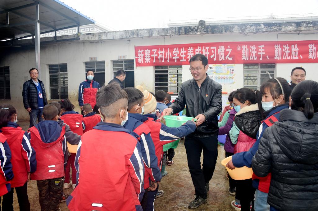 李澤波為我校幫扶的新寨子村小學(xué)的學(xué)生發(fā)放洗漱用品