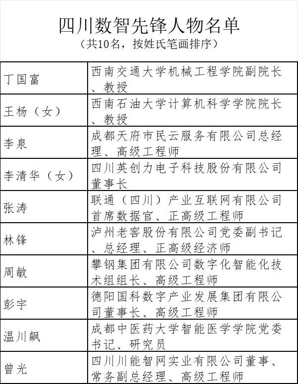 經資格審核、專家初選、網絡評議、評委會終選、組委會審定,最終評選出10名“四川數智先鋒人物”,10名“四川數智先鋒人物提名人選”。