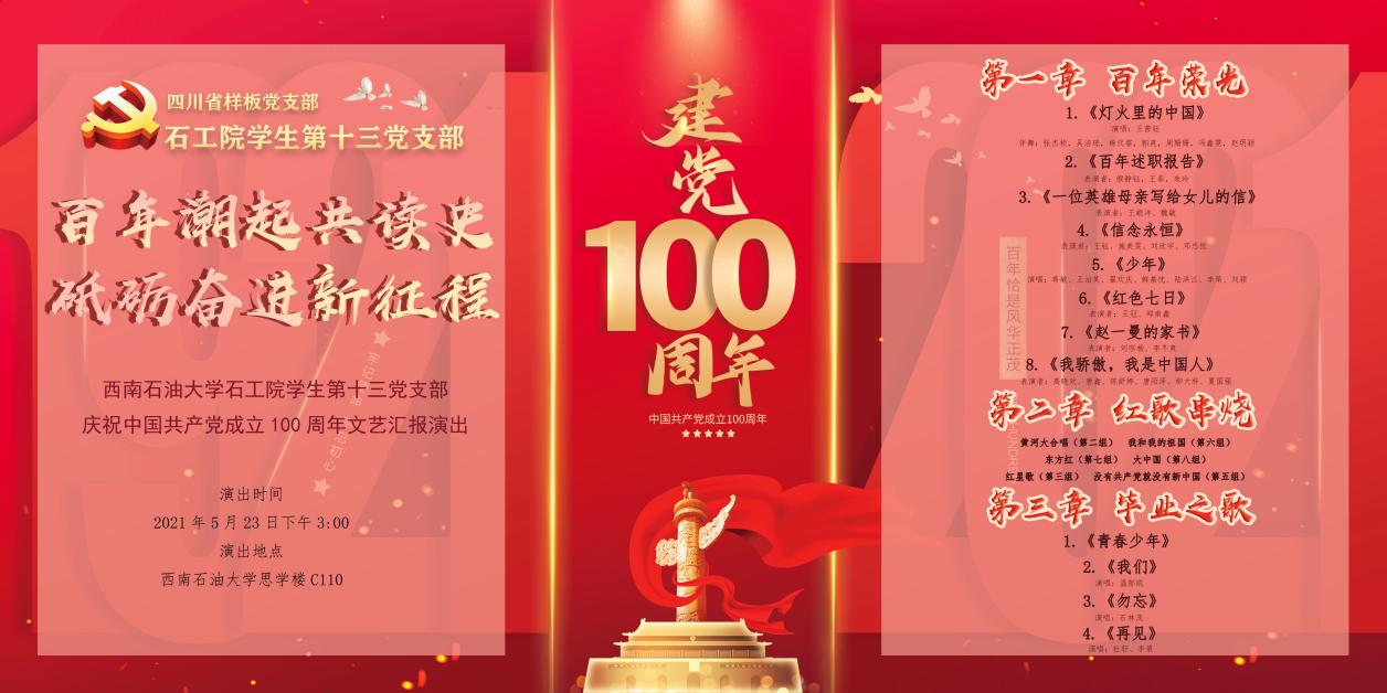 為慶祝中國共產黨成立100周年,扎實推進黨史學習教育,引導青年學生唱響愛黨愛國的時代主旋律,在中國共產黨成立100周年之際,石工院學生第十三黨支部為中國共產黨頌歌...[詳細]