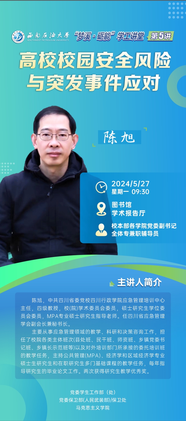 主講人簡介:陳旭,中共四川省委黨校四川行政學院應急管理培訓中心主任,四級教授,校(院)學術委員會委員,碩士研究生學位委員會委員,MPA專業碩士研究生指導老師。任四川省應急管理學會副會長兼秘書長。