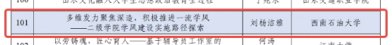 其中,馬院林莉、田恬共同撰寫的《數智時代場館資源融入思想政治教育的出場邏輯與實踐進路》、土測院曾志剛撰寫的《網絡擬態環境下高校資助育人工作的創新策略與實踐探究》、計科院伍曉蕓撰寫的《高校輔導員工作室建設的理論模型與實踐策略》獲評“百佳”論文,經管院王娟、羅昌龍共同撰寫的《同心共育石榴籽,澆灌民族團結花》、化工院程美容撰寫的《打造“三大圈”,讓網絡思政由“掌”入“心”》、地科院劉楊潔雅撰寫的《多維發力聚焦深造,積極推進一流學風——二級學院學風建設實施路徑探索》獲評優秀案例。