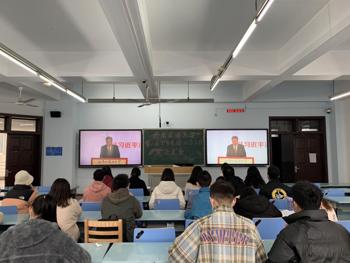 12月4日是我國第八個“國家憲法日”。為認真學習貫徹習近平法治思想,進一步普及憲法知識、弘揚憲法精神、樹立憲法權威。12月3日,學校第八屆“學生先鋒雙百工程”學員于思學樓C303集中觀看了“憲法晨讀”網絡直播。