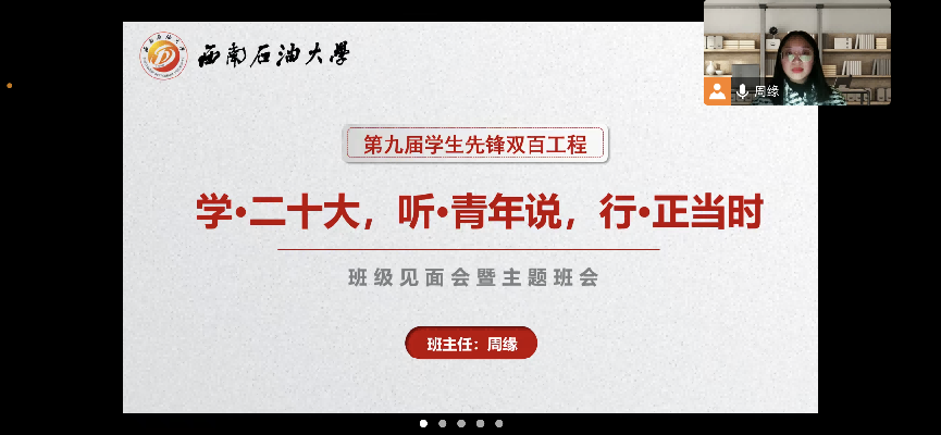 11月24-25日,學生先鋒雙百工程開展“學·二十大、聽·青年說”主題班會,以圍讀會的形式學習黨的二十大報告,雙百工程班主任李安然、彭希寧、周緣帶領(lǐng)全體學院原原本本學、扎扎實實悟,重點圍繞學生黨員、青年學生在疫情期間的使命與擔當進行研討,筑牢思想之基,補足精神之鈣,把穩(wěn)思想之舵。