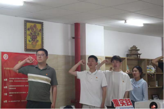 徐婉月為新發(fā)展學(xué)生黨員佩戴黨徽、黃爽帶領(lǐng)全體黨員重溫入黨誓詞。通過莊嚴(yán)的儀式感,喚醒每名黨員的身份意識(shí),不忘初心、牢記使命,堅(jiān)定不移跟黨走,矢志不渝聽黨話。