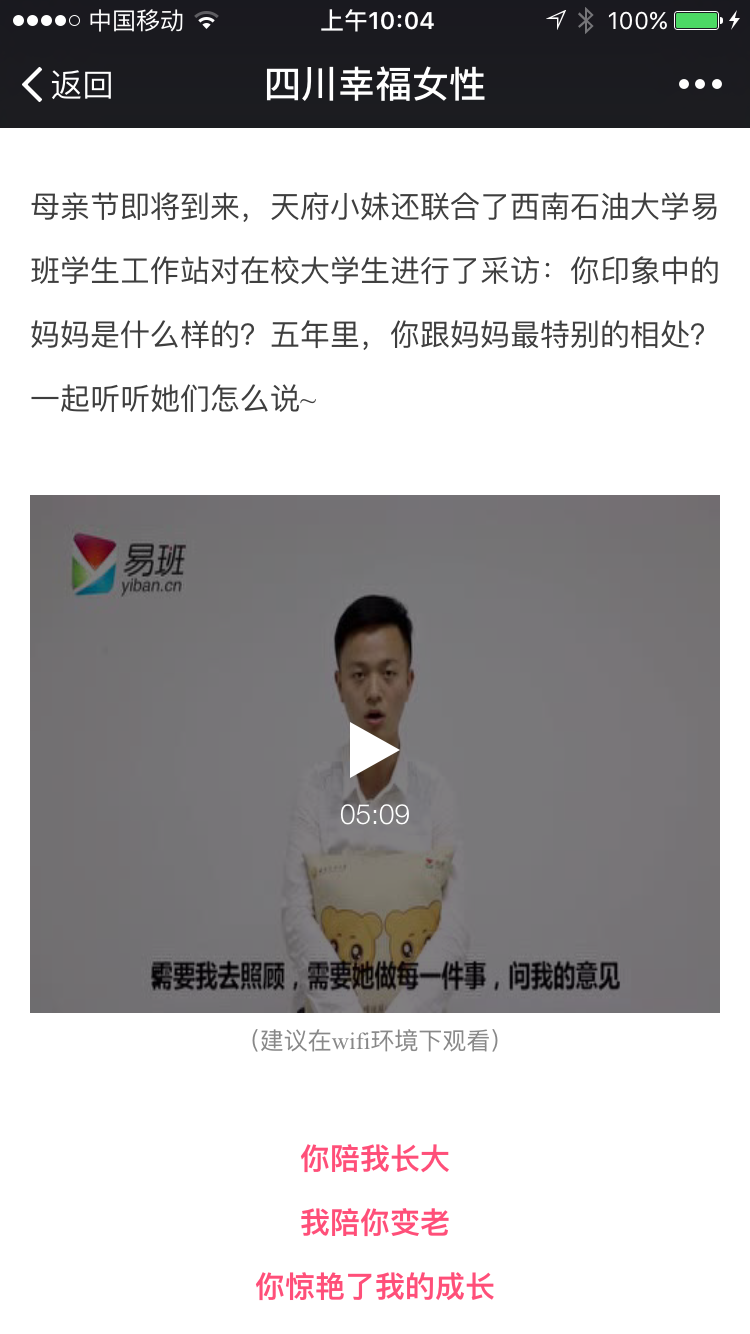 本次活動負責人,學校易班學生工作站副站長經管院單曉潔說到:母親節給我們每個人提供了一個向母親表達愛意的契機和平臺,易班舉辦這樣的活動旨在幫助同學們把羞于對媽媽說出的愛用語言和行動表達出來,你在易班發出的照片或者想對媽媽說的話就是送給媽媽最好的禮物,在母親節當日把這份禮物截屏發給媽媽,給媽媽打一個電話,告訴她“媽媽,我愛你”或是說上一句“媽媽,你辛苦了”都是對她最好的表白。(學校易班學生工作站歐聯紅)