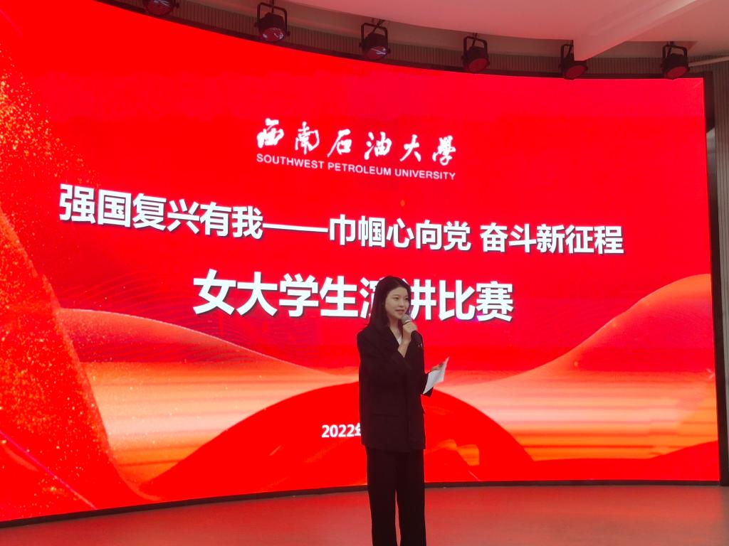 2022年10月25日,西南石油大學“強國復興有我——巾幗心向黨 奮斗新征程”女大學生演講比賽在思學樓C110順利舉行。黨委學生工作部(處)副部(處)長陳俐宏、招生就業處職業生涯發展指導中心專家羅興婭等領導、老師蒞臨比賽現場。