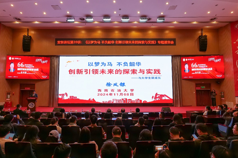 2024年11月8日上午,學校66周年校慶系列活動之安東講壇第39講在學校圖書館學術報告廳隆重舉行。我校校友、地質學家、博士生導師,被譽為“推動深部煤層氣第一人”的徐鳳銀教授為在場師生作了題為《以夢為馬 不負韶華 創新引領未來的探索與實踐》的專題報告。中國工程院院士、原西南石油大學校長羅平亞,國家享受政府特殊津貼有突出貢獻專家、原西南石油學院副院長李士倫,四川省有突出貢獻專家、原西南石油大學教授顏其彬,學校黨委副書記、校長郭建春出席活動,報告會由學校黨委副書記、工會主席衡彤主持。