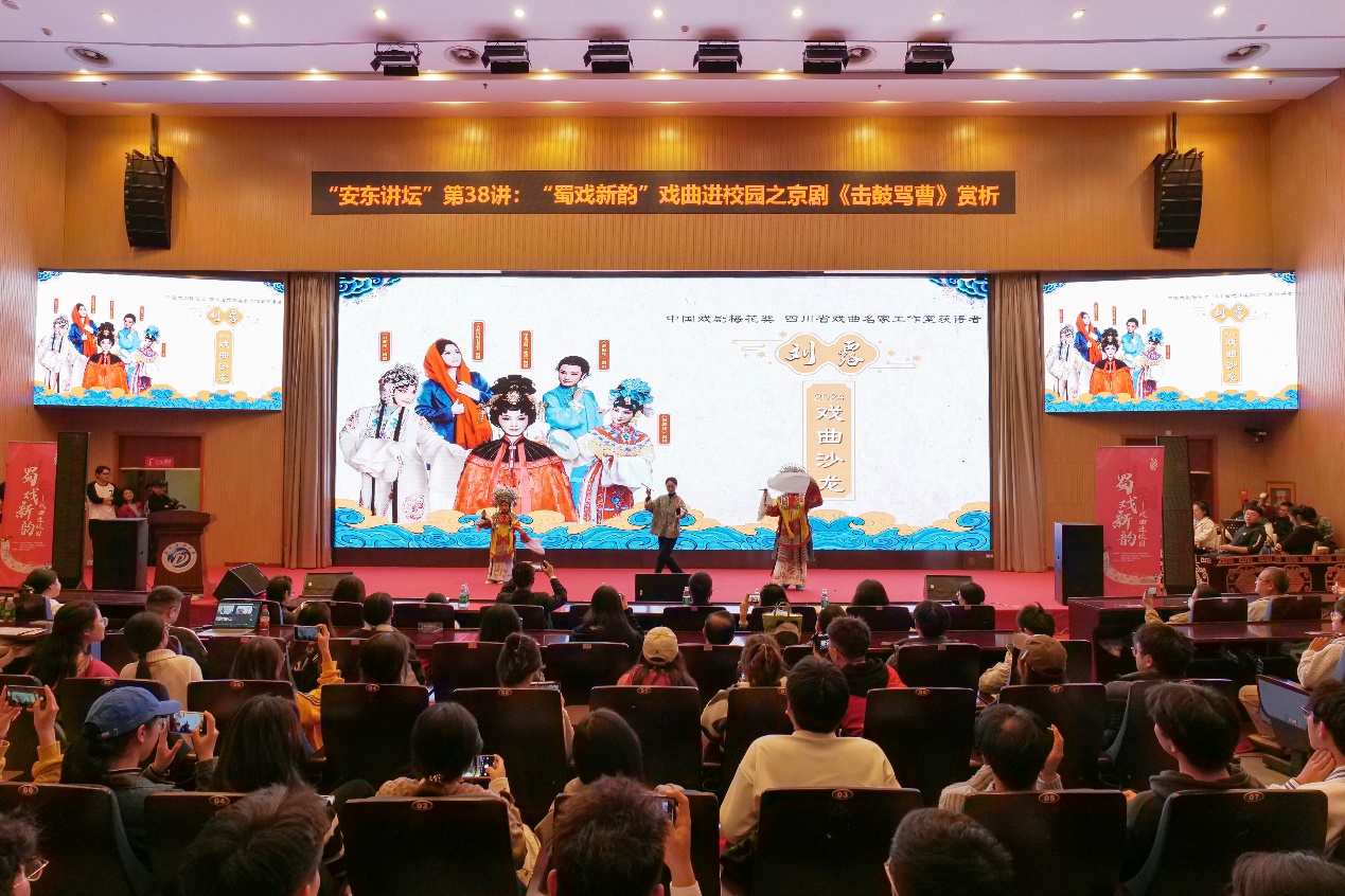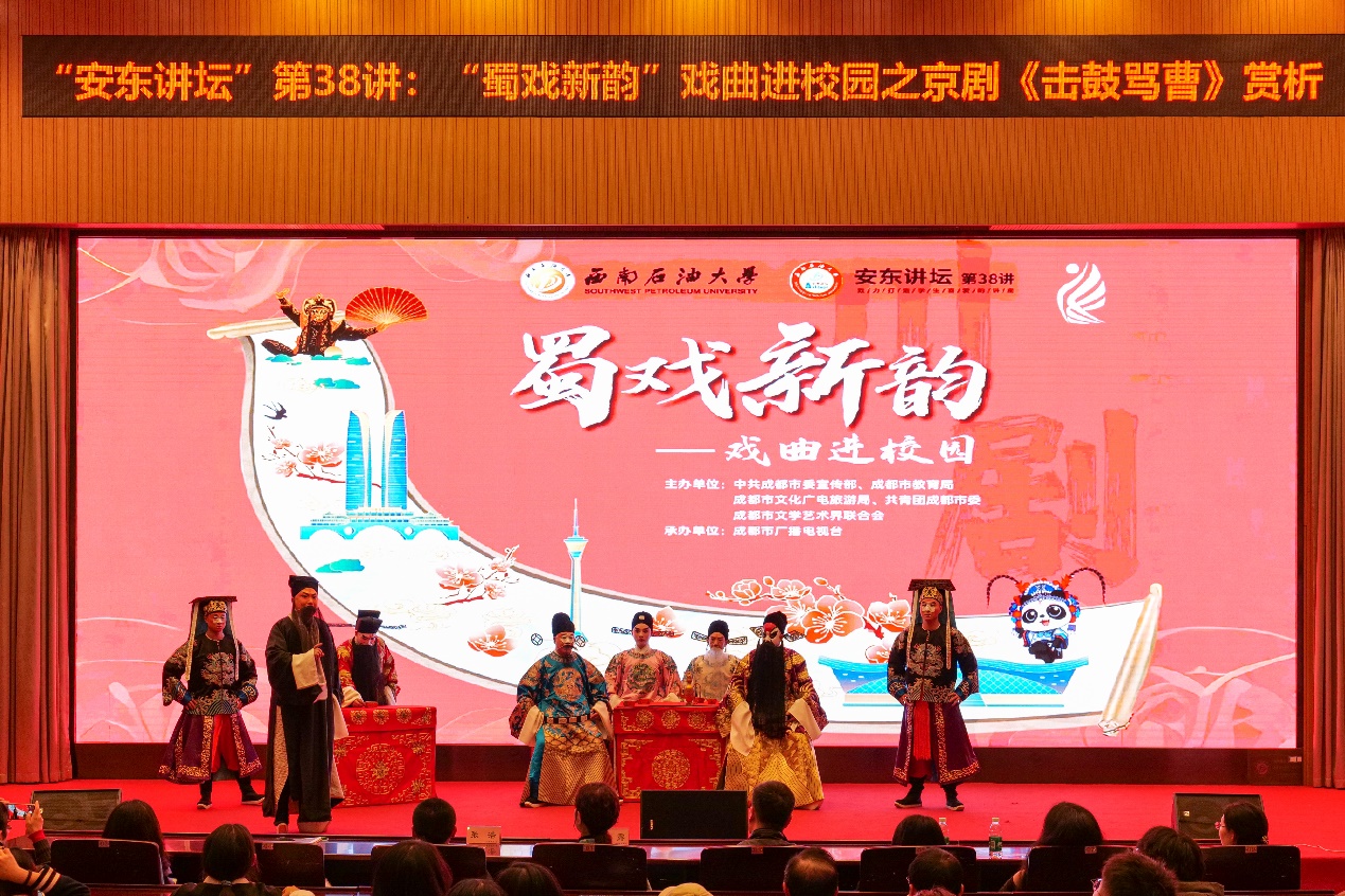 2024年11月3日晚,“安東講壇”第38講以“蜀戲新韻”戲曲進(jìn)校園之京劇《擊鼓罵曹》賞析為題,特邀成都市京劇研究院走進(jìn)西南石油大學(xué),傳統(tǒng)京劇老生折子戲《擊鼓罵曹》精彩上演,弘揚(yáng)中華優(yōu)秀傳統(tǒng)文化。