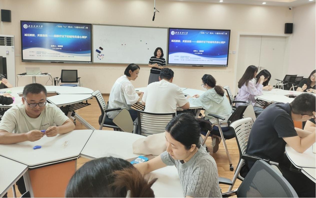 為幫助輔導員緩解工作壓力、提升身心照護能力,6月19日,西南石油大學心理中心以“減壓賦能,關愛自我——敘事療法下的輔導員身心照護”為主題,舉辦第四期“校院‘心聯動’”專題培訓。心理中心專職教師胡美麗擔任主講,通過藝術療愈與敘事對話,引導輔導員探索壓力本質,學習自我關懷方法。