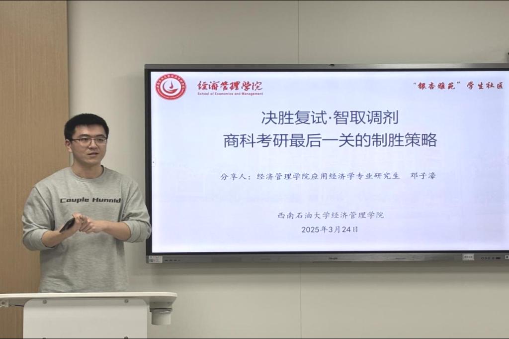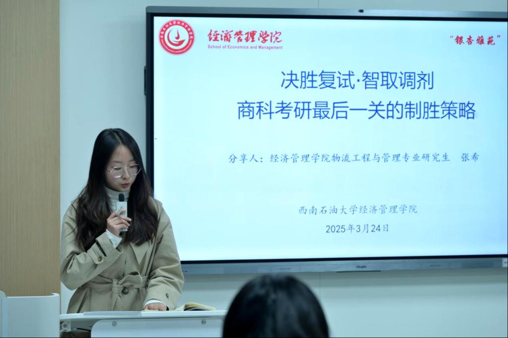 3月24日,為響應學校“一站式”學生社區建設要求,經濟管理學院作為銀杏雅苑作為區長制建設單位,面向全校商科考研學子舉辦考研復試及調劑經驗分享會。會議于博學樓B102開展,聚焦面試禮儀、復試技巧、調劑策略等關鍵環節,通過教師指導、研究生經驗分享等多元化形式,為備考學子構建系統性備考方案,著力強化臨場應變能力與競爭優勢。