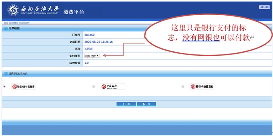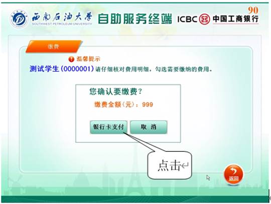 核對(duì)圖1-2“學(xué)號(hào)”、“姓名”、“費(fèi)用總額”無(wú)誤后,點(diǎn)擊右下角“支付”按鈕, 進(jìn)入支付界面如圖1-3。